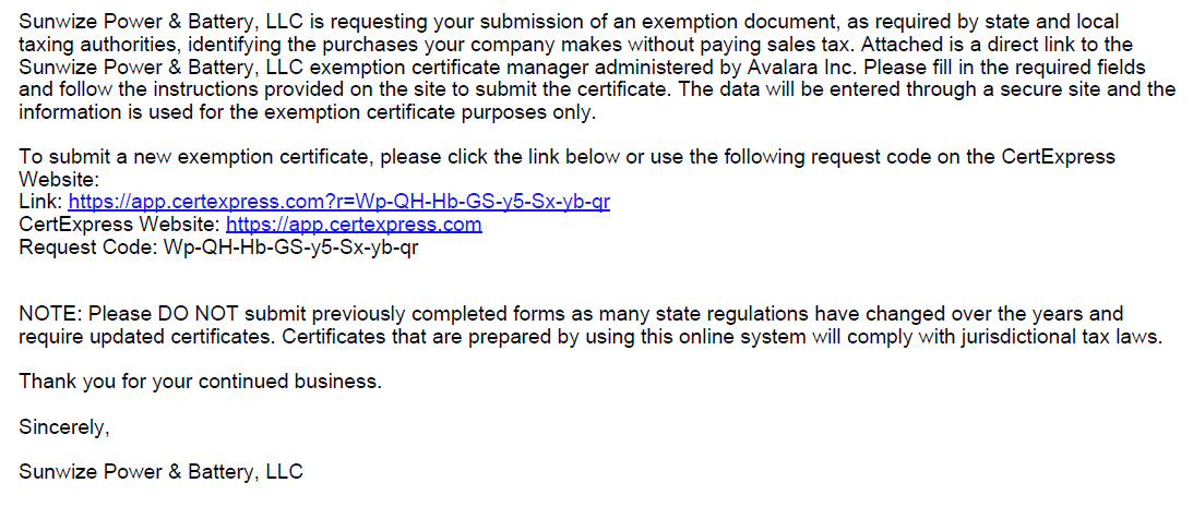 To keep your account exempt where applicable, please email ar@sunwizepower.com current sales tax exemption certificate(s) for each state in which you claim exemption.