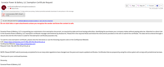 If your exemption is not received promptly, you may receive an automated email from our tax compliance partner, Avalara, requesting these documents. See example below;