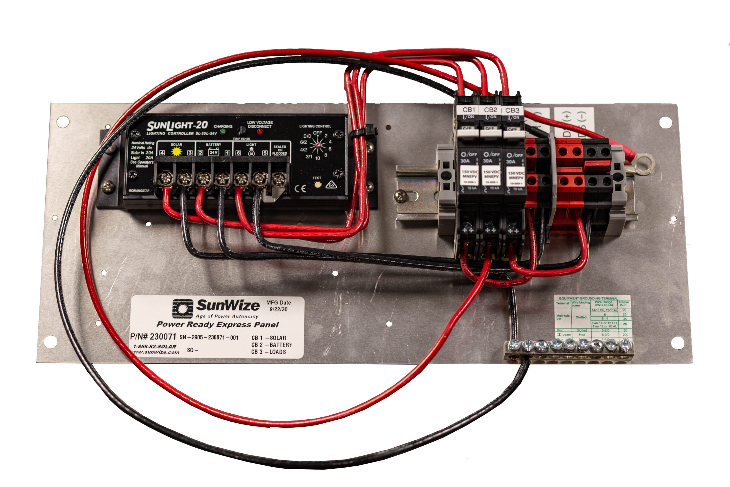 SunWize PR Express Panel PWM 230071 is a prewired aluminum control panel for our Power Ready Express systems. It has all of the necessary switchgear to hook up a charge/load controller to a solar array, battery bank, and load. SunWize Charge controllers have ratings between 6A and 40A are available in standard power ready express control panel configurations. The PWM versions can use the power from the solar array more efficiently than the standard PR Express control panels and have additional features.